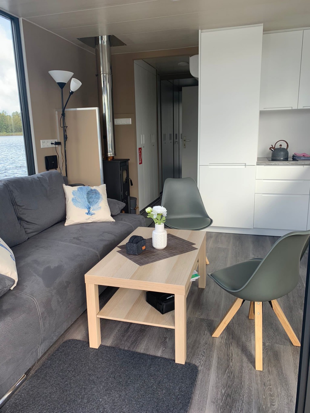 Sie betreten das Boot über die Bugterrasse und stehen im großen Wohnbereich mit Couchecke und Kamin, sowie kompletter Küchenzeile.